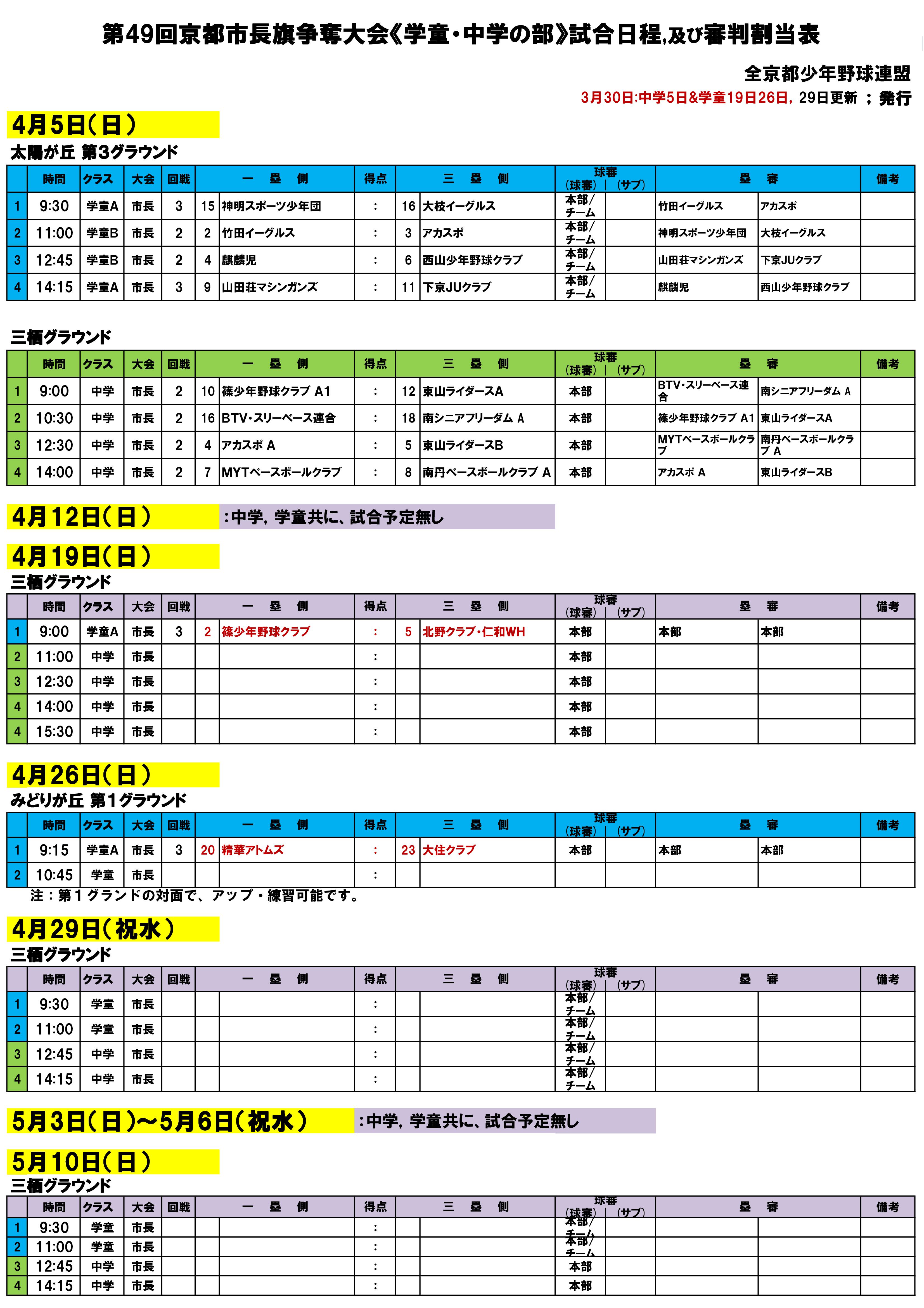 【3/30日:中学,学童追加】試合日程&審判割当:第49回京都市長旗争奪大会(学童&中学)